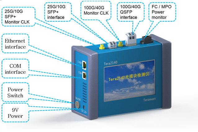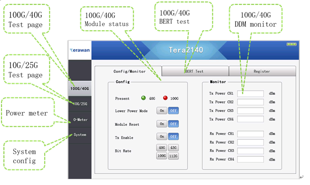 The Tera2140 could support transceiver DDM function and check the module live status. And pattern generator and BER error checker, which could work individual support 10G/25G/40G/100G test.